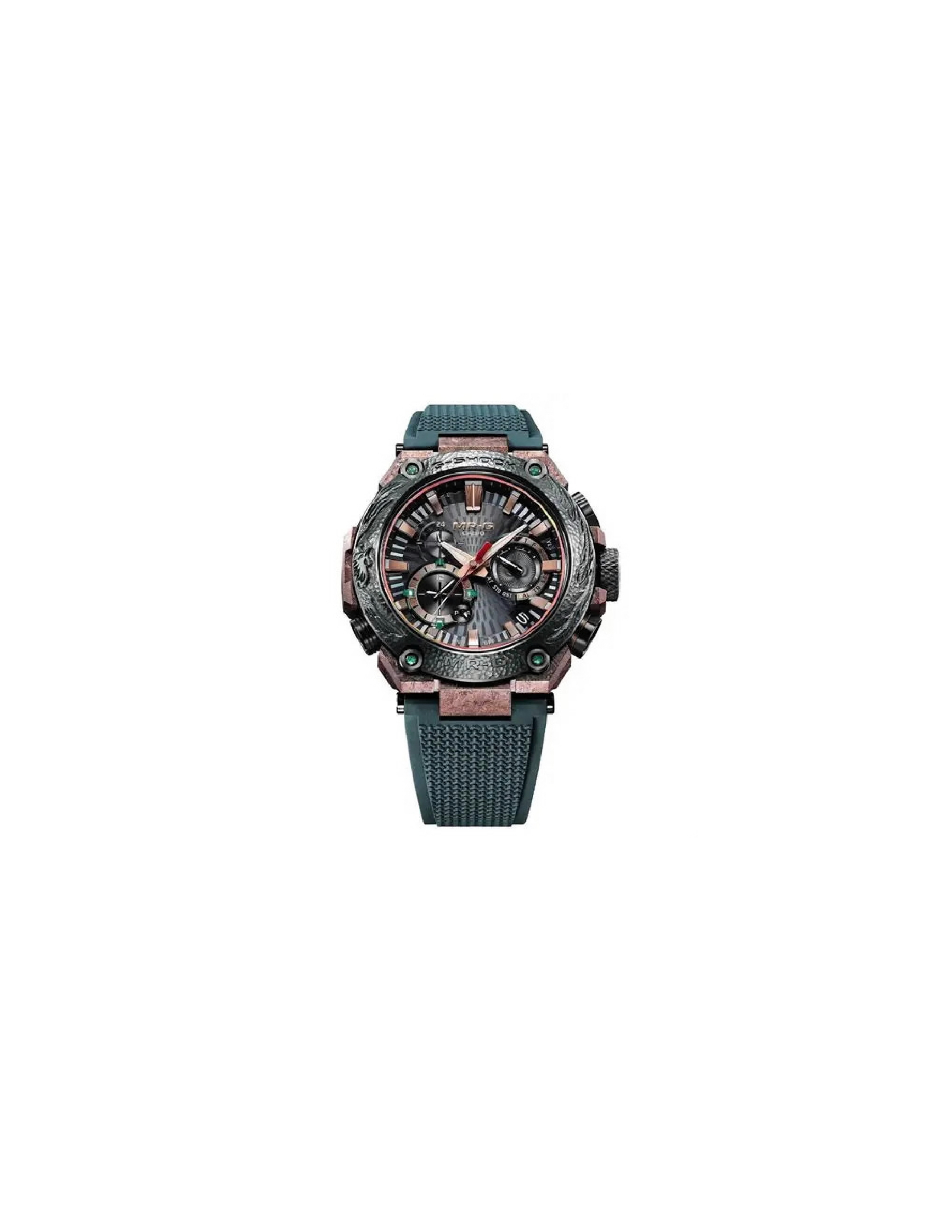 La edición limitada de 800 unidades MRG-B2000KT se inspira en la guardia de hierro kurogane-tsuba de la katana japonesa.Realizado a mano por el herrero KOBAYASHI Masao, el bisel lleva grabado el diseño de un ave fénix, símbolo de buena fortuna, Cada reloj de edición limitada está grabado a mano por un maestro artesano,por lo que son únicos.Carcasa, bisel y cierre de Titanio con una fuente de alimentación Solar.